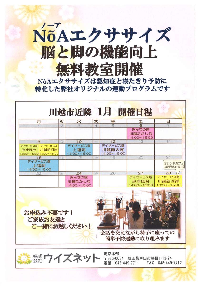 会場:デイサービスセンター遊・川越新河岸日時:1月 8日(月) 14:00~15:00日時:1月28日(日) 13:30~15:00