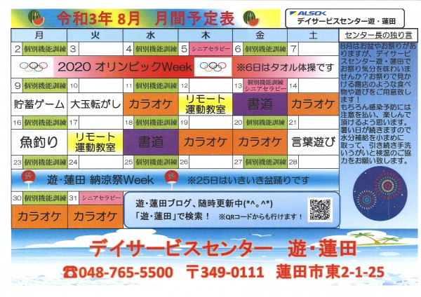 そして来月の8月レクリエーション表ができましたのでこちらでも記載させて頂きます。
