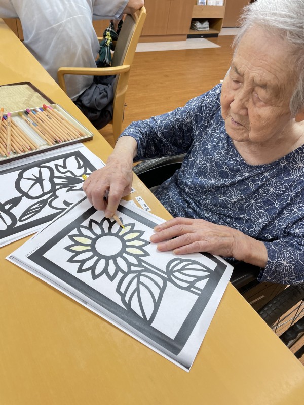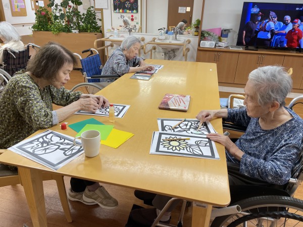 夏場の花といえばひまわりですが、ひまわりの塗り絵を皆さまで塗るも良し、貼り絵にするも良しのフリータイムでございます。