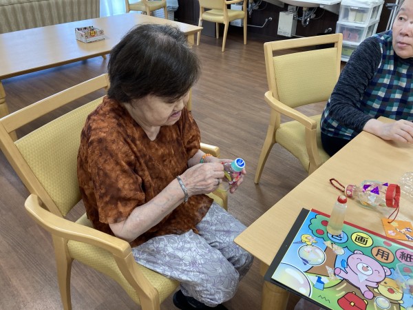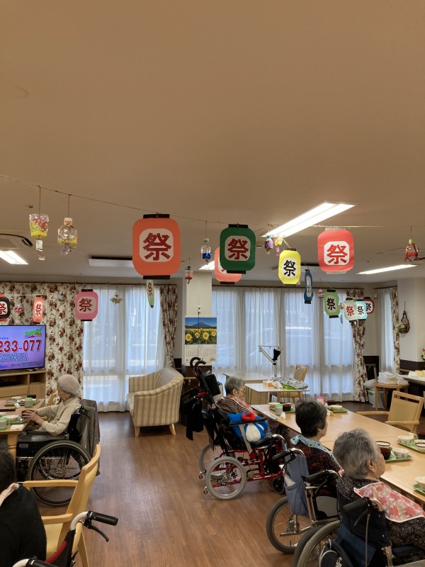祭りの雰囲気だけでも先取りしようと各階装飾し、入居者様にも飾り作りのお手伝いをしていただきました。