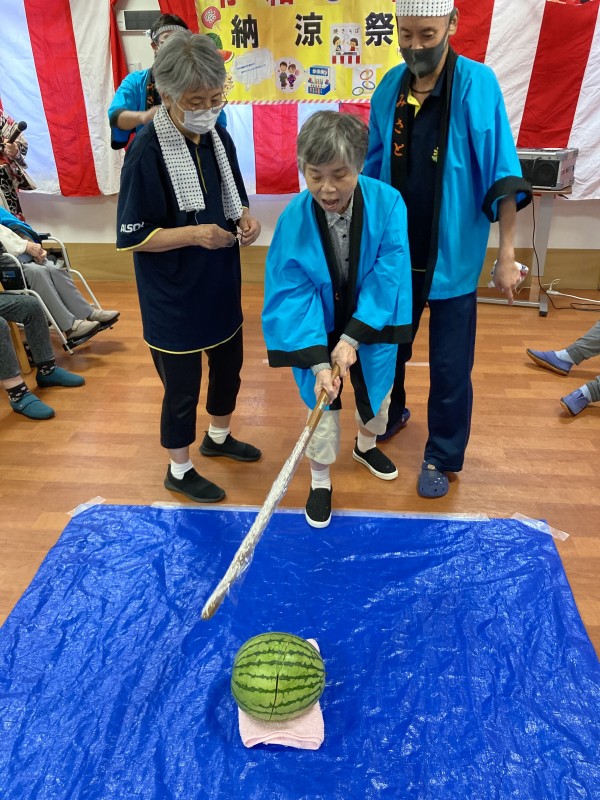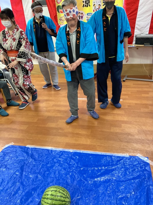 納涼祭の最後の演目には、スイカ割りを行いました(#^.^#)