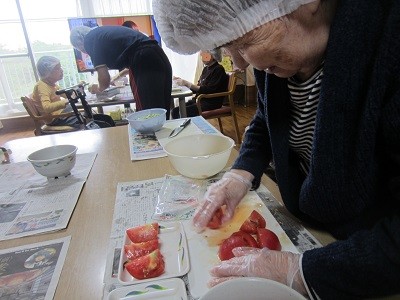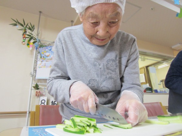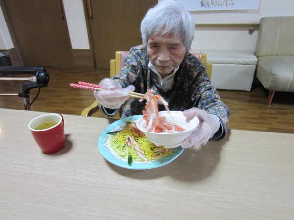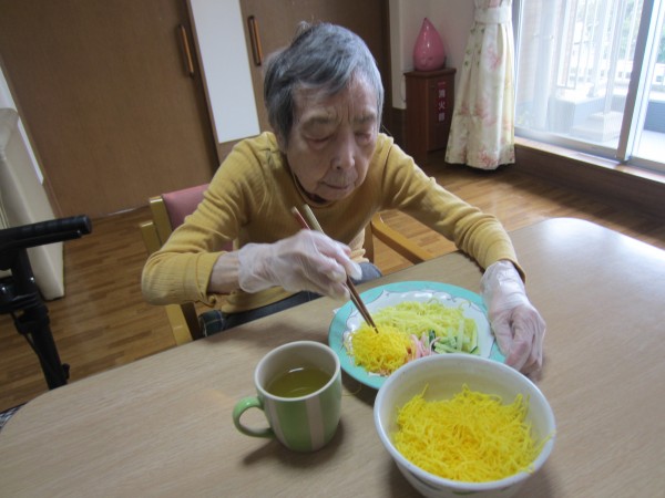 胡瓜を刻んだり、かにかまを裂いたり、盛り付けも各自で行いました。