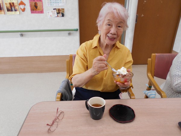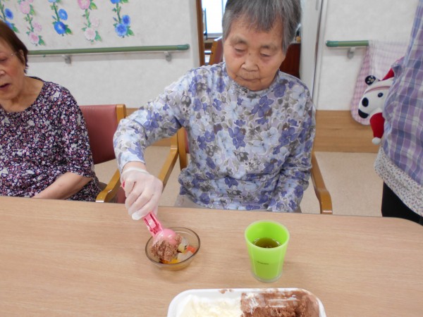 「いっぱいのせちゃおうー」「おいしそうね。早く食べたいわ~」とみなさん楽しみながらアイスクリームを取っていました( *´艸`)