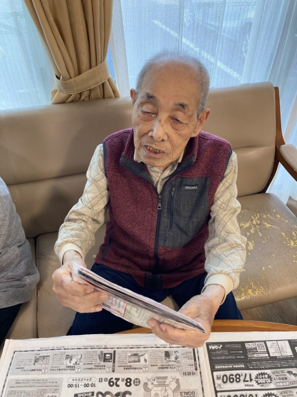 フロアで傾眠されているKさん(写真左/上)、新聞を眺めておられるIさん(同中/中)、お得意のおどけた表情と笑顔が出ないAさん(同右/下)