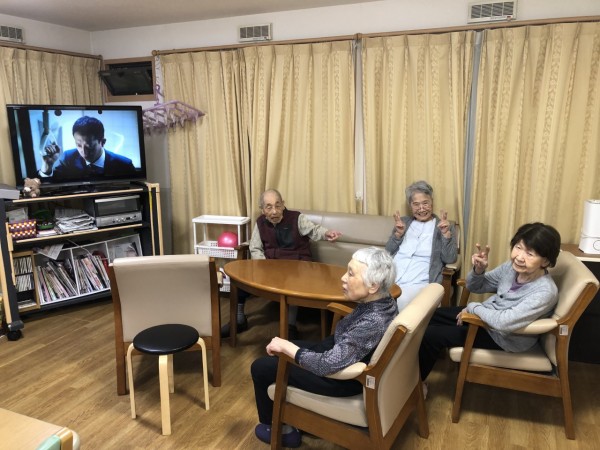 夕食後の口腔ケア後に、みなさん少しづつ自主的にフロアに集まってこられ、TVを観ながら、談笑が始まりました。