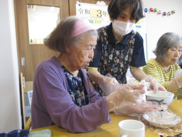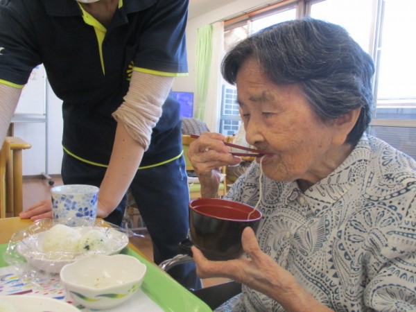 昼食の様子です。おにぎり・そうめん・トマトとブロッコリのハチミツ付けを作り召し上がられていました。美味しいね、こんなの食べたことないよ・・と完食し満足されていました。