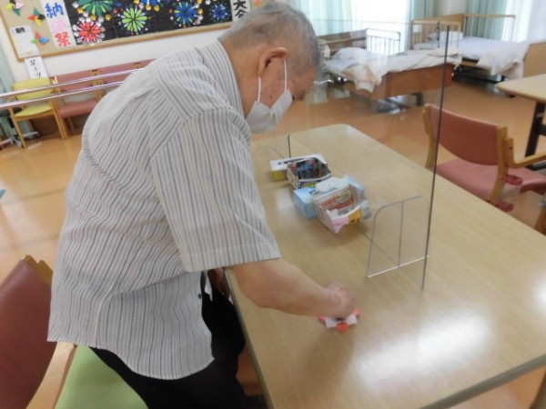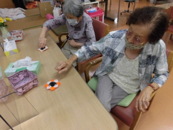 本日は「コマ回しゲーム」という初めてのレクリエーションを行いました!