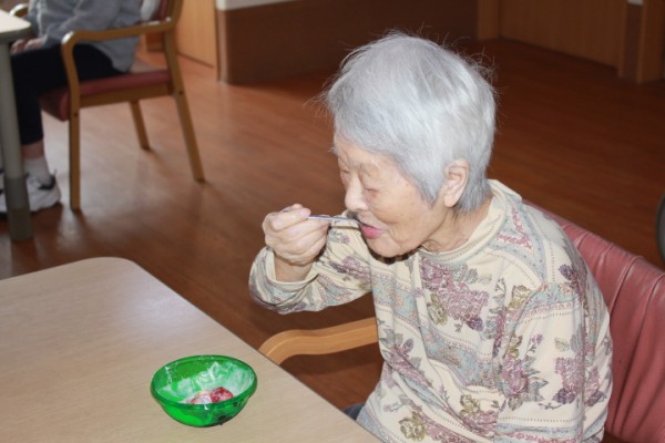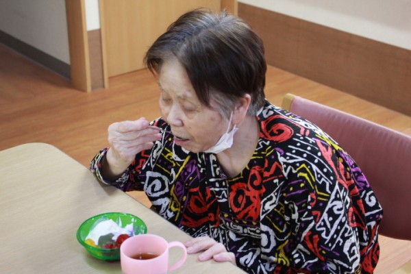盆踊りに参加した後のおやつ、特性フルーツパフェ、中身は、アップルゼリーに、イチゴ、マンゴー、ブルーベリー、バニラアイス、ホイップクリームで飾り付けのパフェです。