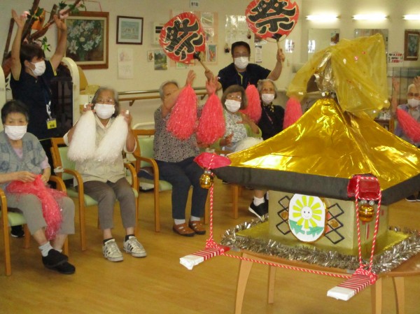 まずはいきいきリズム体操を盆踊りの曲に合わせ実施しました。ポンポンや祭りの団扇や御神輿で、みんなで、