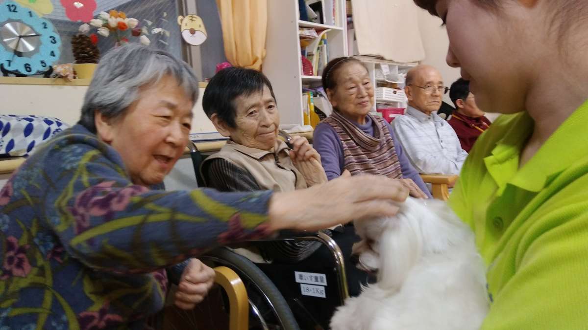 かわいいプードル達から、大きなゴールデンレトリバーまで、たくさんの犬とのふれあいに入居者様も思わずにっこり♪