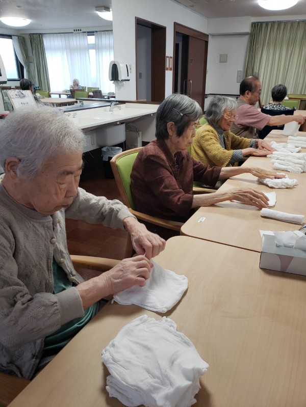 先日3階の入居者様が【お絞り作り】を手伝って下さいました(*^^*)