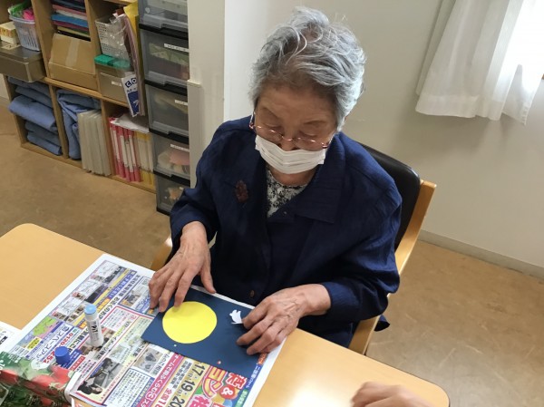 紺色の画用紙に黄色の月を貼り付けていきます。