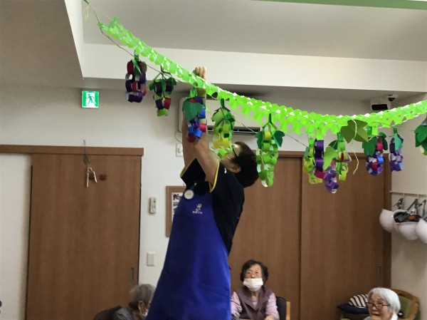 紫や黄緑色、時には???というような、きれいな折り紙も仲間入りしていますが、色とりどりのぶどうができあがり、