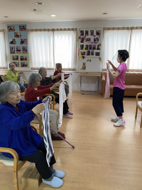 先日、運動指導員の岡庭先生とタオル体操を行いました!