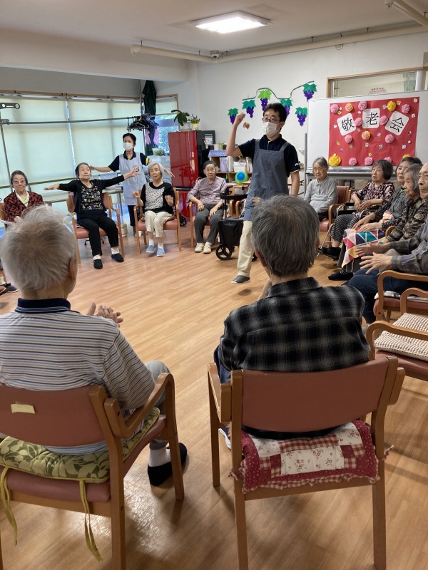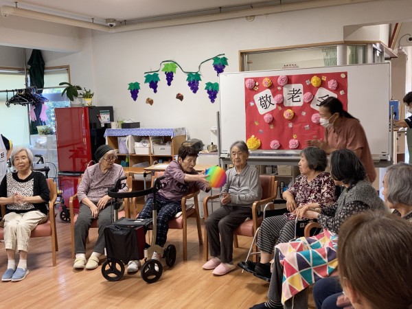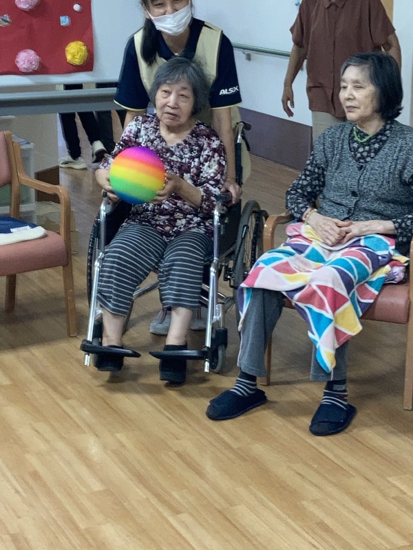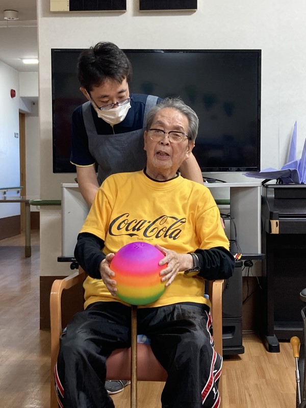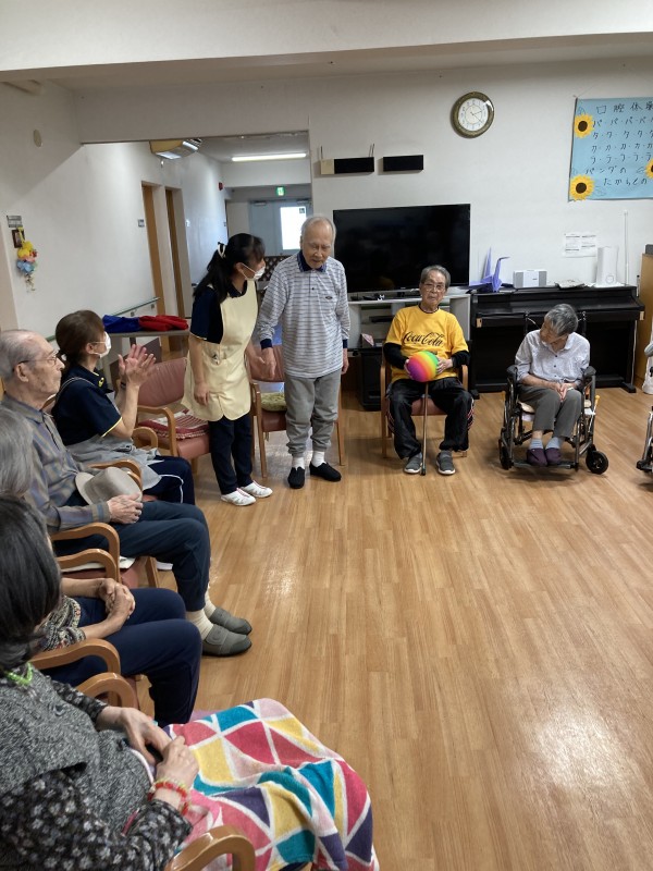 音楽に合わせてボールを回し、音楽が止まった人が自己紹介をする。椅子取りゲームの要領です。