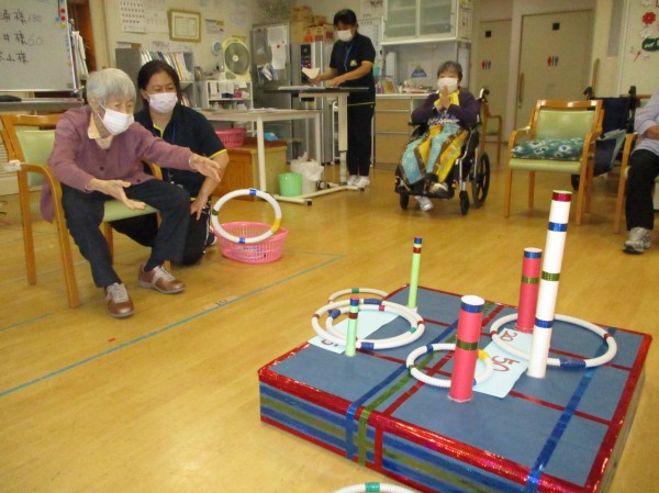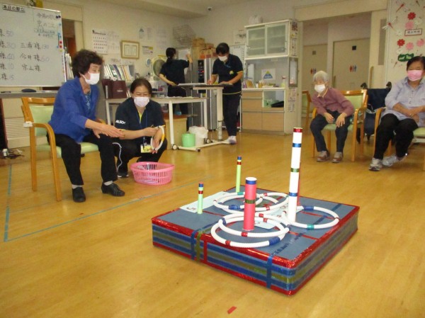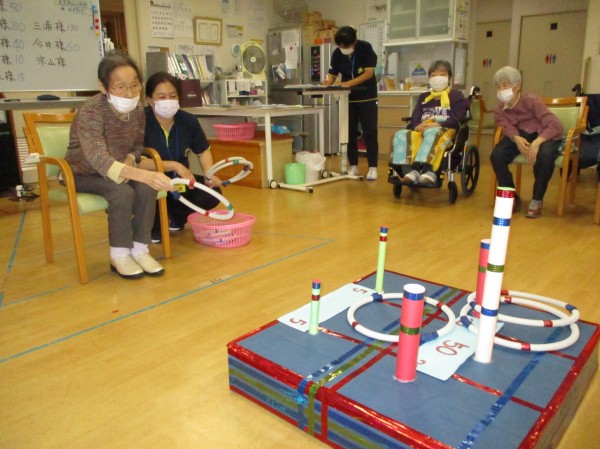 今日の運動レクレーションは『輪投げ』です。太さや高さの違うポールに上手く輪っかを入れ、得点数で競います。