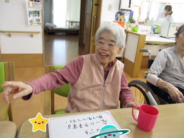 ホワイトボードで筆談したり手を触ったり