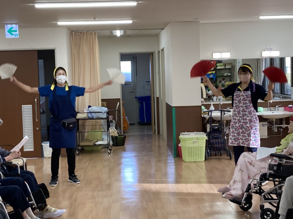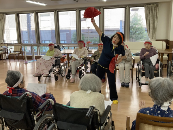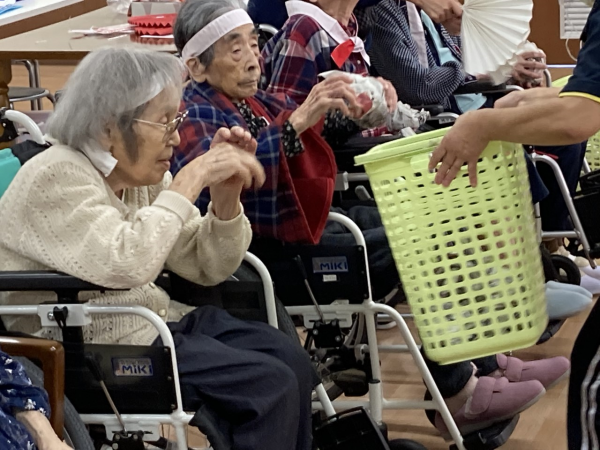 みんなハチマキをして、気合をいれてミニ運動会スタート!よく見ると、ハチマキを格好良くしめているご利用者さまもいます♪