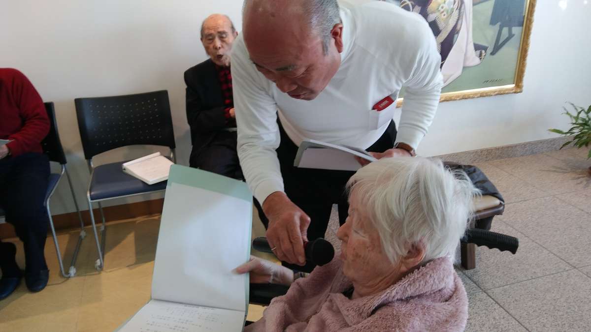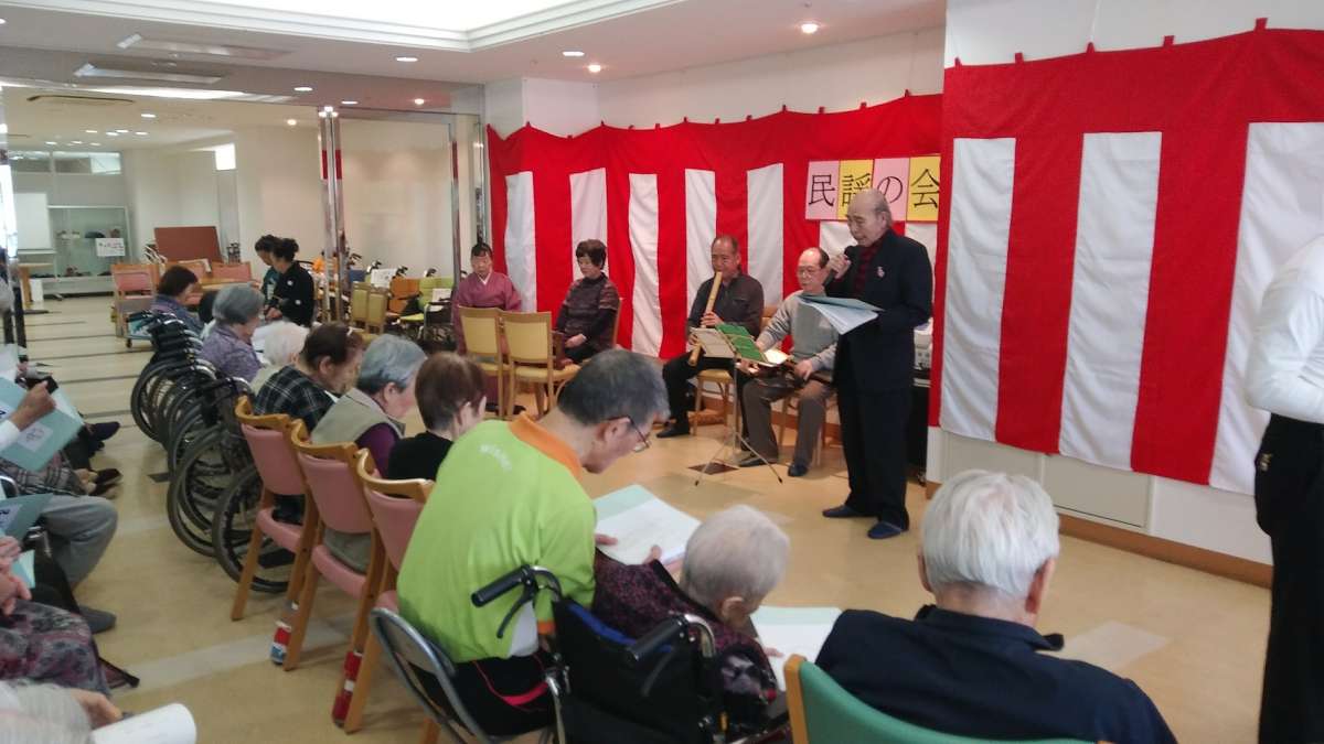 グループホームみんなの家・西尾久の、第3日曜日は、以前にもご紹介致しましたが『繁水会』による民謡の会の日です。昨年の4月に、『繁水会』の先生方の御好意によりはじまりました。『繁水会』の先生方のご入居者様を楽しませようという気持ちから、毎月新しい曲が増え増えに、最初は7~8曲ほどだった歌詞集が現在は42曲にまでになっています!