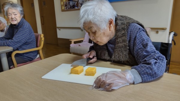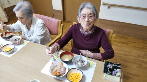 お赤飯やお刺身などを提供し、午後は3階に全員集まりレクリエーションを行い、お祝いのカードを贈呈致しました。