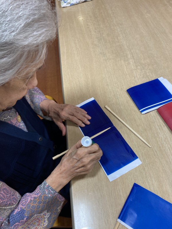 赤色と青色の旗のような物を作っていただき