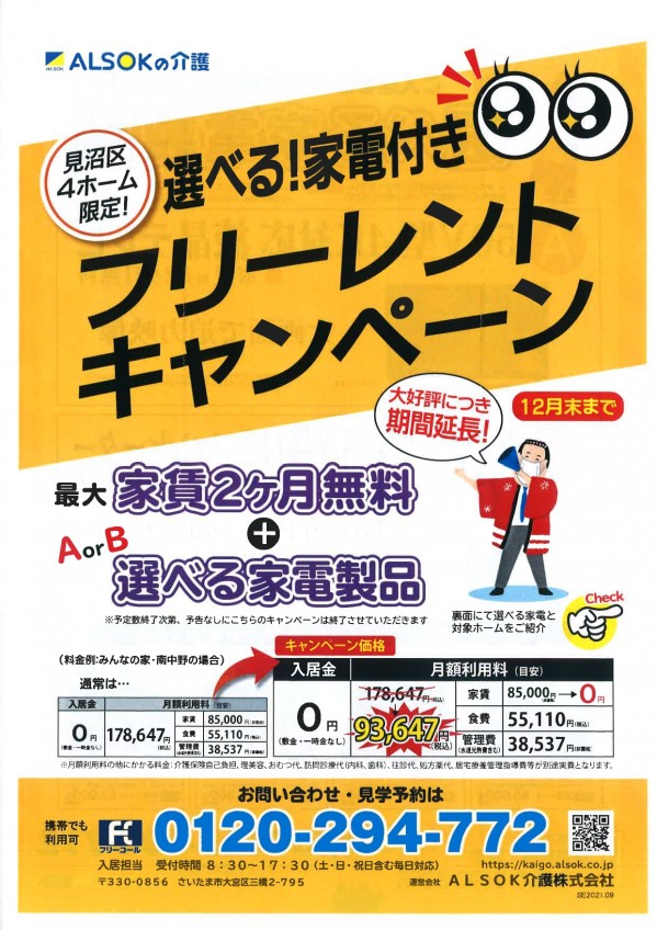 【ALSOK介護株式会社】見沼区介護有料老人ホーム4ホーム限定キャンペーン!ご入居者様募集中!!【選べる家電付きフリートレントキャンペーン!】(*ฅ́˘ฅ̀*)♡