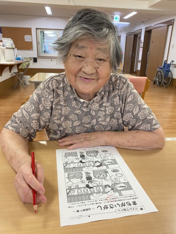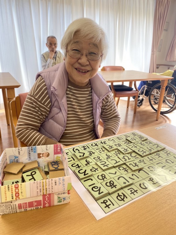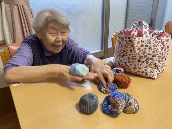 ◉スタッフに『お手玉』の遊び方を教えてくださる女性入居者様。