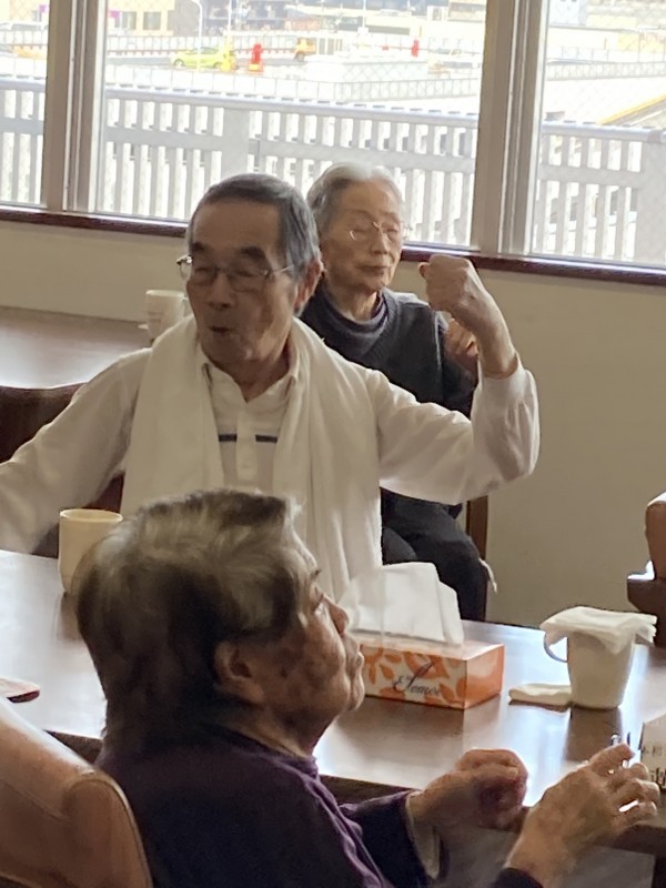 いつものように「昼食前体操」を始めようとしたら・・・いきいきリズム体操でお馴染みの岡庭先生が急遽訪問です!