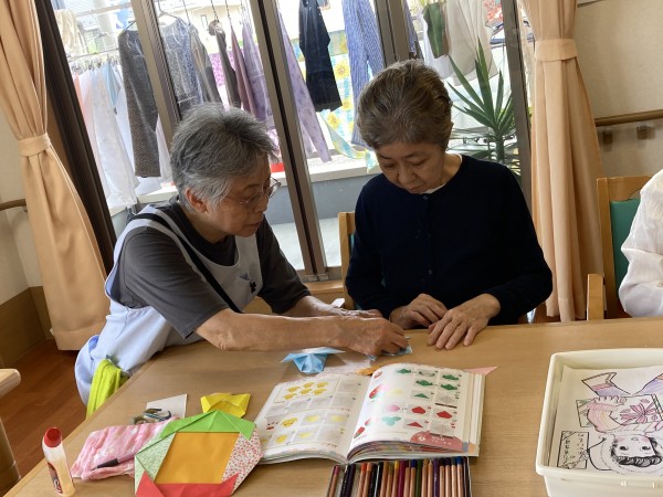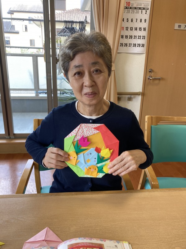 レクリエーションの時間に折り紙で壁飾り作りを行いました!!