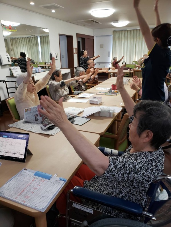 今日もフロアで皆さん看護師サンの指示の元腕を上げてストレッチ!!