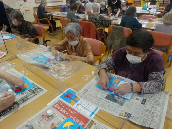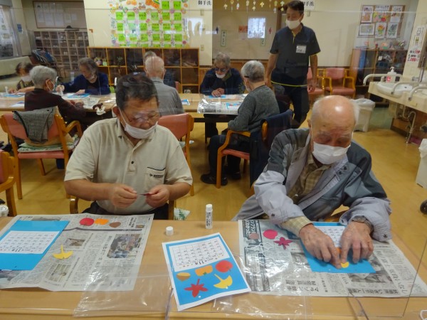 カレンダーを貼った後は、職員が用意した“もみじ” “イチョウ” “りんご” “柿” “栗” 5種類を好きなところに貼っていただきました。
