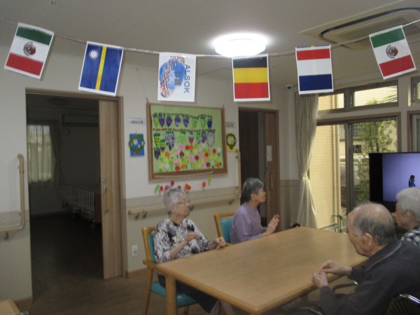 1階のフロアには万国旗が飾られて、運動会の準備が進んでいます。