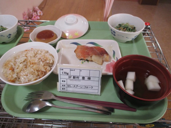 メニューの中身は、五目炊き込みご飯 清汁 赤魚の粕漬け焼き