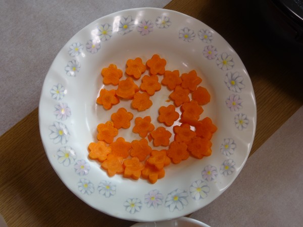茹でた人参を長めに切り、お花の形に型抜きしていきます!