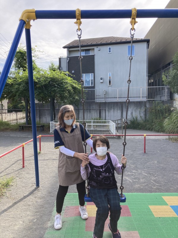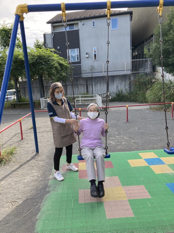 こちらの公園には鉄棒や砂場やブランコがあり入居者様はブランコに乗っていただきました。