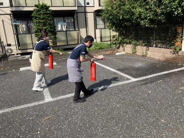 消火訓練は初期消火の成功確率を上げるために行ないました。(水消火器を使用しました。)