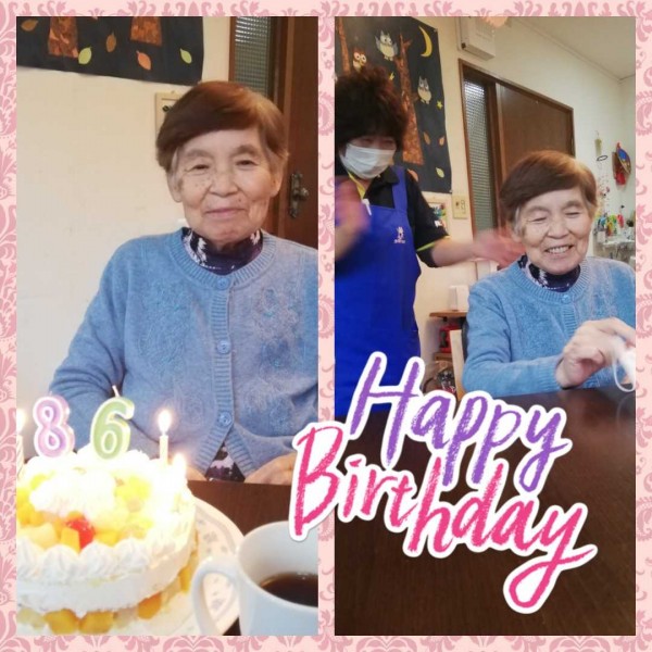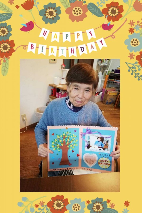 職員がデコレーションしたケーキと、手作りのカードでお祝いです。