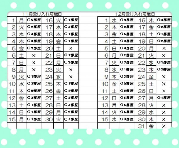 11月・12月の受け入れ可能日を