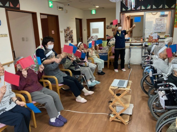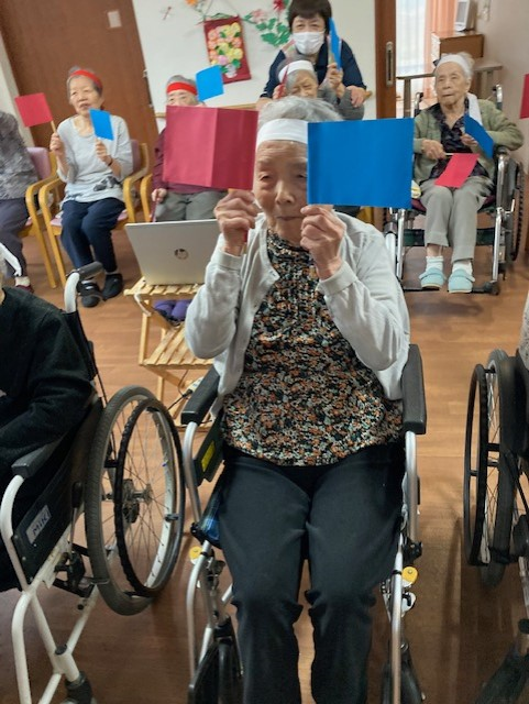レクの時間に作成した「赤・青の旗」を使い、指示された色の旗をあげます