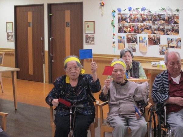亜佐美先生の「赤あげて~青上げて~」の掛け声と一緒に皆さん真剣な顔で旗揚げ!(^^)!