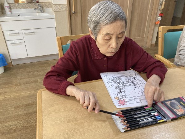 季節に合わせた塗り絵も、完成した作品はフロアに飾っています。