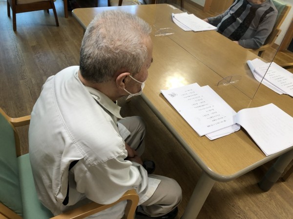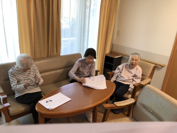 一方、わたしたちホームのみなさんのレクリエーションとしては、定番のカラオケや各種イベント、作品づくりに加えて、最近では、みんなで童謡を歌う(写真左/上・左2/上2・左3/上3)・トランプをする(同右/下)がマイブームになっています。