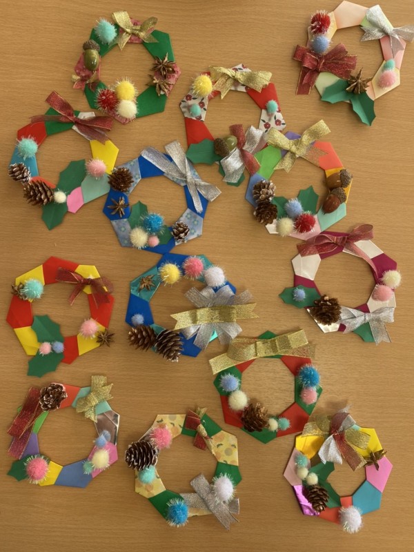 ◉折り紙でクリスマスリースを折り、組み立てる。