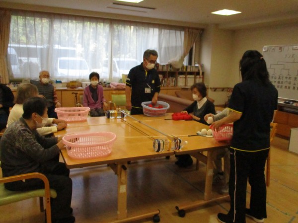 今日の運動レクレーションは『リンボーお手玉』です!紅白に2人1組のチームに分かれ