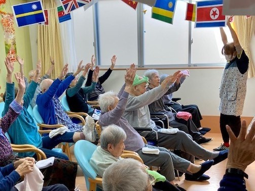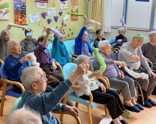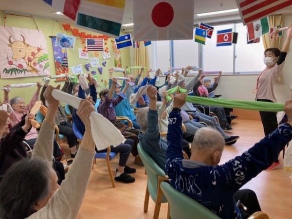 グループホームみんなの家・墨田でタオルを使った「AK体操」を楽しむ