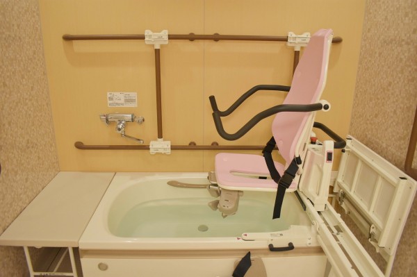 ピンク色の座面が昇降するので、お客様は座っているだけで安心して入浴できます♪