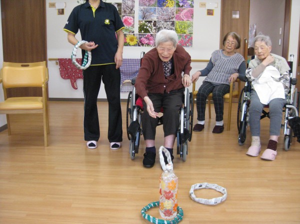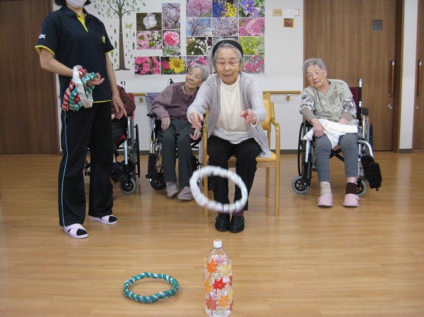 こんにちは!グループホームみんなの家・あきがせの介護ブログですよろしくお願いいたします。ゲームとして輪投げ遊びを行いました!!中々的の中に入らないよ・・・と悔しそうでした(´;ω;`)