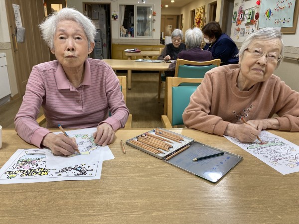 1階ご入居者様の塗り絵の様子です。