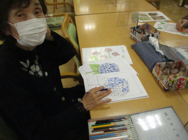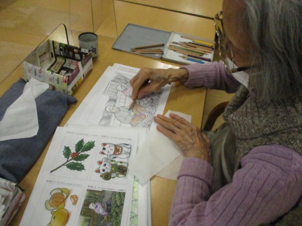 皆さんそれぞれのタッチで塗り絵を塗っておられました。年一回の文化祭に出品されています。お上手です!