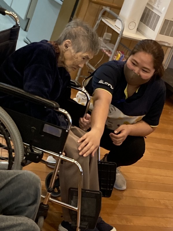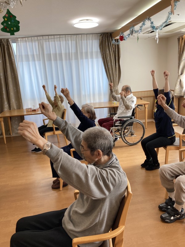 一人ではなかなか動かせない方も、職員のサポートで一緒に行い楽しそうに運動してくださいます。